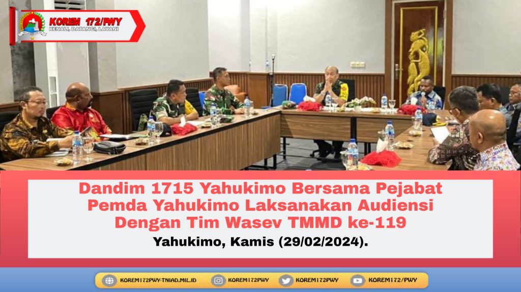 Yahukimo – Dalam rangka memperkuat sinergi antara TNI Angkatan Darat dan Pemerintah Daerah, Dandim 1715 Yahukimo bersama sejumlah Pejabat Pemerintah Daerah Yahukimo melaksanakan pertemuan tatap muka dengan Tim Wasrik Evaluasi (Wasev) TNI Manunggal Membangun Desa (TMMD) ke-119, bertempat di Kediaman Bupati Yahukimo untuk membahas berbagai program pembangunan yang dilakukan di wilayah Yahukimo, Kamis (29/02/2024).