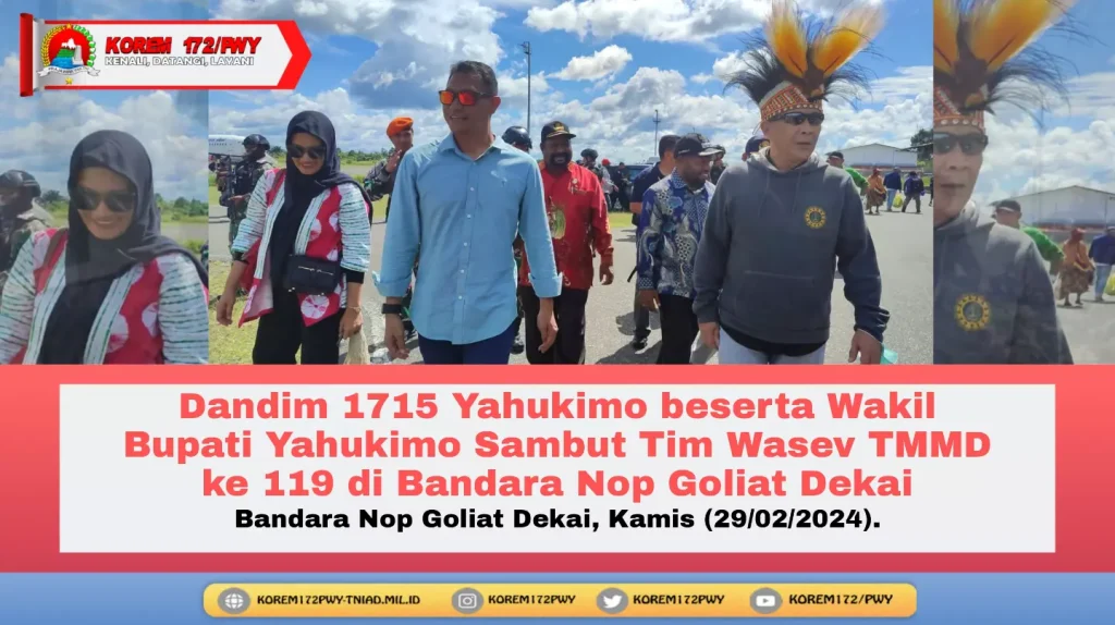 Yahukimo – Wakil Bupati Yahukimo Esau Miram, S.IP. menyambut kedatangan Tim Wasev TMMD ke-119 Brigjen TNI Erdy Jammi Lumintang dengan hangat dan penuh keramahan, di Bandara Nop Goliat Dekai, Kamis (29/02/2024).