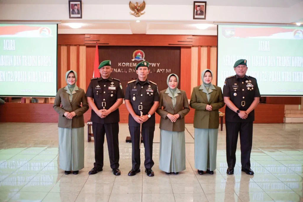 Jayapura – Komandan Korem 172/PWY Brigjen TNI Dedi Hardono, S.I.P., memimpin acara Serah Terima Jabatan (Sertijab) dan Tradisi Korps Kepala Staf Korem (Kasrem) 172/PWY, bertempat di Aula Makorem, Abepura, Kota Jayapura, Papua, pada Rabu (13/3).