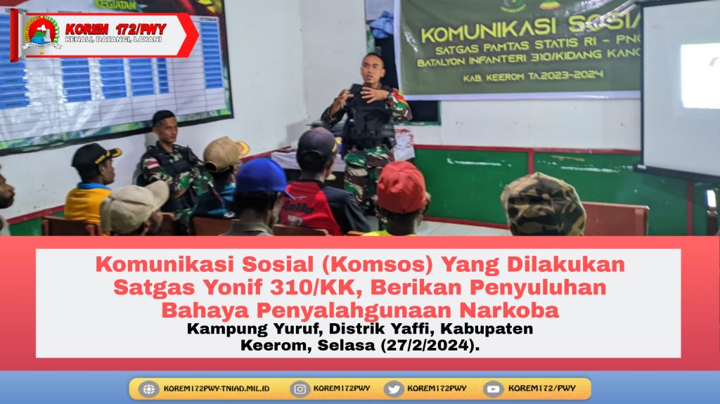 Keerom ~ Pos Yuruf Satgas Yonif 310/KK gelar Komunikasi Sosial (Komsos) dengan segala lapisan masyarakat di wilayah perbatasan RI-PNG serta berikan penyuluhan tentang bahaya penyalahgunaan Narkoba kepada warga di Kampung Yuruf, Distrik Yaffi, Kabupaten Keerom, Selasa (27/2/2024).