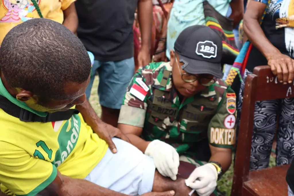 Kesempatan tersebut Satgas Yonif 122/TS menggelar kegiatan Sosial, dengan melaksanakan pelayanan kesehatan dan membagikan susu mineral kepada anak-anak Kampung Banda, Distrik Waris, Kabupaten Keerom, Papua, (29/03/2024).