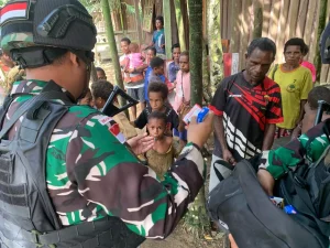 Keerom ~ Menjaga kebersihan dan kesehatan warga, Pos Kalipao Satgas Yonif 310/KK bagikan sabun mandi untuk warga sekitar di Kampung...