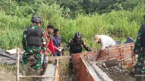 Keerom ~ Mengatasi kesulitan masyarakat serta demi keselamatan pengguna jalan, Pos Bompay Satgas Yonif 310/KK bersama warga bergotong royong perbaiki...