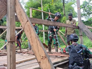 Pegunungan Bintang ~ Wujudkan kemanunggalan TNI bersama rakyat di wilayah Perbatasan RI-PNG, Pos Batom Satgas Yonif 310/KK bantu proses pembangunan...
