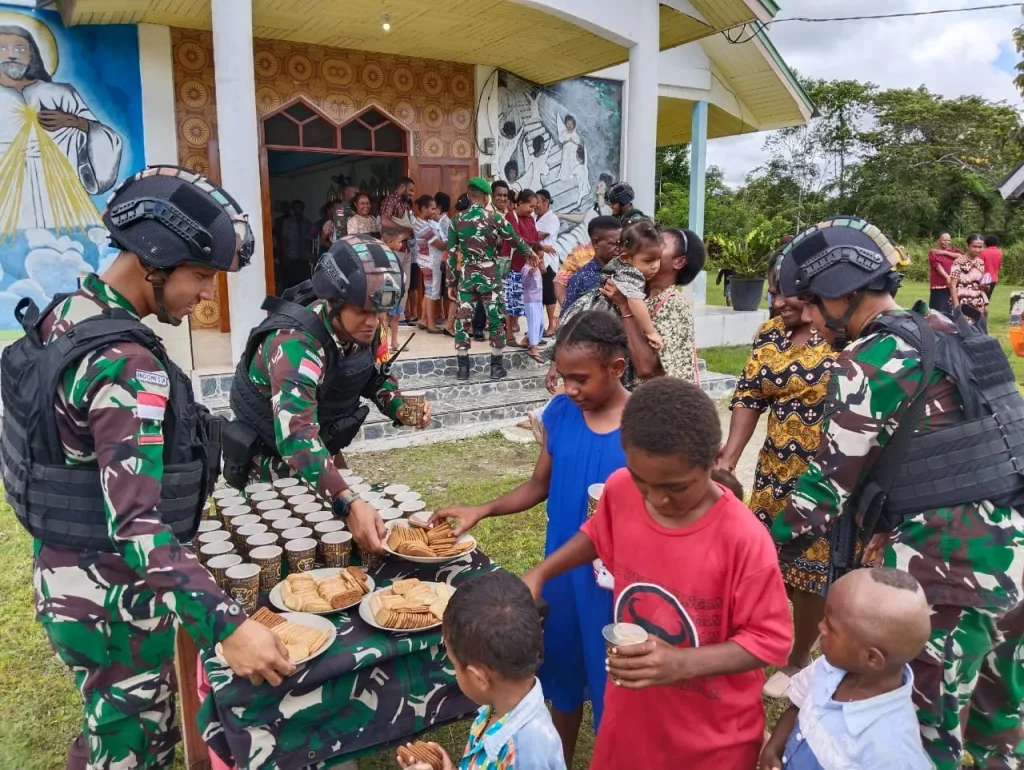 Dalam pelaksanaannya, pembagian susu dan biskuit seusai melaksanakan ibadah ini dipmpin langsung oleh Pasiter (Perwira Seksi Teritorial) Letda Inf As’ari beserta personil Satgas dari Pos Senggi.