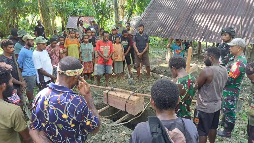 Pegunungan Bintang ~ Memberikan bantuan dan dukungan penuh kepada keluarga yang berduka, Pos Batom Satgas Yonif 310/KK dipimpin Letda Inf Effendi selaku Danpos (Komandan Pos) bantu proses pemakaman jenazah balita bernama Oksibila (4) yang meninggal karena sakit di Kampung Batom 1, Distrik Batom, Kabupaten Pegunungan Bintang, Minggu (3/3/2024).