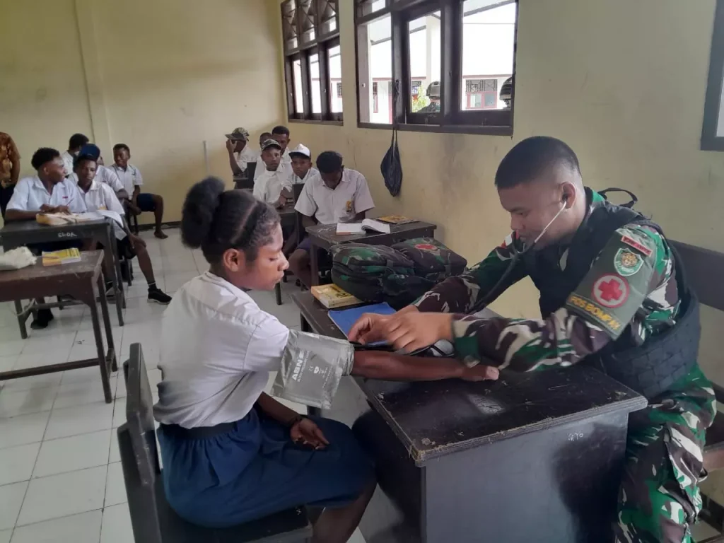 Keerom ~ Tingkatkan pengetahuan dan kesadaran akan pentingnya menjaga kesehatan dan mencegah penyakit, Pos Bompay Satgas Yonif 310/KK berikan penyuluhan dan pemeriksaan kondisi kesehatan bagi pelajar SMP Satap Bompay di Distrik Waris, Kabupaten Keerom, Kamis (28/3/2024).