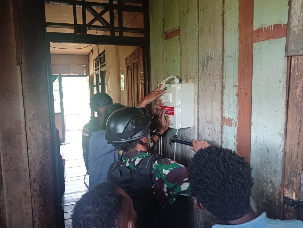 Pegunungan Bintang ~ Kondisi malam di pedalaman Papua kini berbeda dari malam sebelumnya, yang dulu gelap gulita kini menjadi terang, Pos Serambakon Satgas Yonif 310/KK pasang instalasi listrik dengan menggunakan teknologi SPEL (Stasiun Pengisian Energi Listrik), APDAL (Alat Penyimpan Daya Listrik) dan IRAS (Instalasi Rumah Arus Searah) di Kampung Seramkatop, Distrik Serambakon, Kabupaten Pegunungan Bintang, Kamis (14/3/2024).
