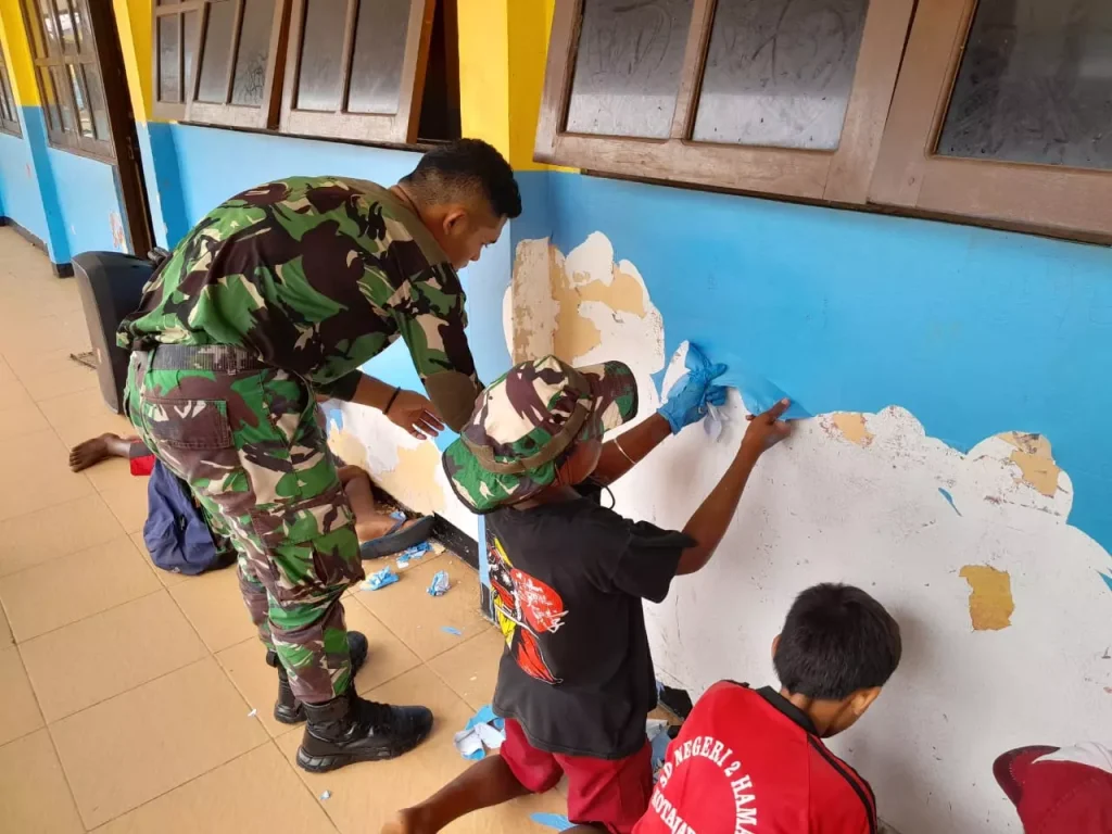 Jayapura- Dalam rangka mendukung sarana dan prasarana pendidikan generasi penerus Bangsa, Personel Satgas Pamtas Statis RI-PNG Yonif 122/TS Berinisiatif memperbaiki dan memperbarui cat bangunan Sekolah Dasar Inpres Skouw Mabo, yang dilaksanakan bersama guru dan murid secara bersama-sama di Skouw Mabo Distrik Muara Tami, Kabupaten Jayapura, Papua, Jum’at (15/03/ 2024).