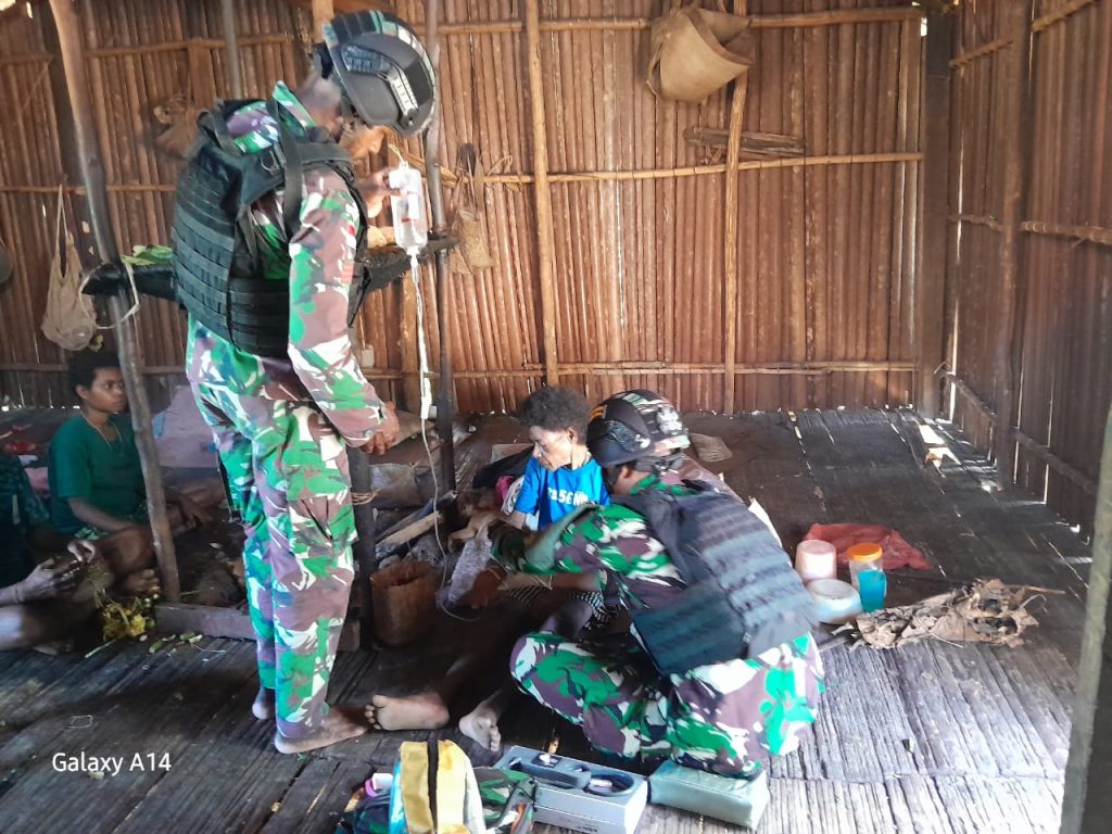 Keerom ~ Peduli akan kondisi kesehatan warga di perbatasan RI-PNG, Pos Tatakra Satgas Yonif 310/KK Obati Tania Sam (65) yang terjangkit malaria di Kampung Tatakra, Distrik Web, Kabupaten Keerom, Sabtu (2/3/2024).