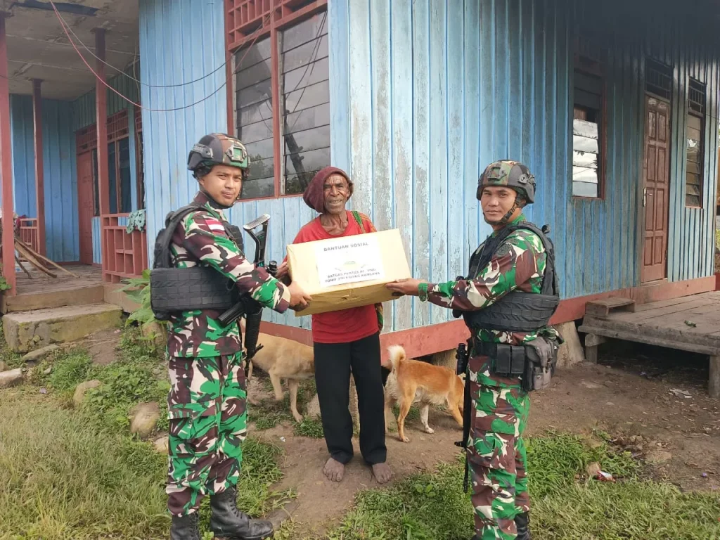 Pegunungan Bintang ~ Pos Serambakon Satgas Yonif 310/KK terus tunjukan kepeduliannya terhadap masyarakat yang mengalami kesulitan ekonomi dengan berikan Bansos berupa puluhan paket sembako di Kampung Seramkatop, Distrik Serambakon, Kabupaten Pegunungan Bintang, Rabu (6/3/2024).
