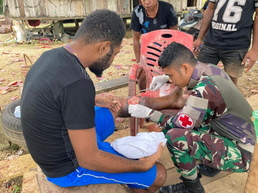 Jayapura- Bulan suci ramadhan tak menyurutkan semangat personil Satgas Yonif 122/TS untuk melayani masyarakat yang membutuhkan terutama dalam bidang kesehatan yang mendesak seperti yang dilakukan Takes Pos Mosso berikan pertolongan pada pace aerok (32) yang terdapat luka dan pembengkakan di bagian kakinya serta memerlukan perawatan di kediamannnya di Kp. Mosso Distrik Muaratami, Kota Jayapura.(18/03/2024)