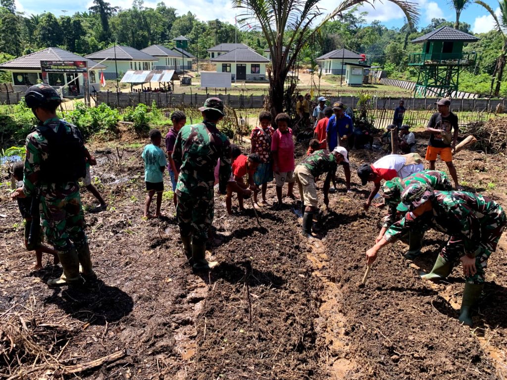 Keerom ~ Dalam rangka berbagi ilmu pengetahuan dengan masyarakat di wilayah perbatasan RI-PNG, Pos Somografi Satgas Yonif 310/KK gelar penyuluhan pertanian di Kampung Somografi, Distrik Web, Kabupaten Keerom, Jumat (1/3/2024).
