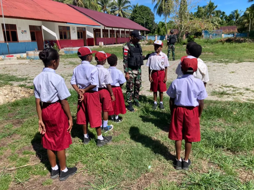 Distrik Muaratami- Satuan tugas pengamanan Perbatasan RI-PNG Batalyon Infanteri 122/TS yang berada dibawah komando kolakops korem 172/PWY ikut serta berikan pengetahuan tentang baris – berbaris di Sekolah Dasar Negeri Mosso yang berada di Kp. Mosso, Distrik muaratami, Kota Jayapura. Selasa(05/03/2024).