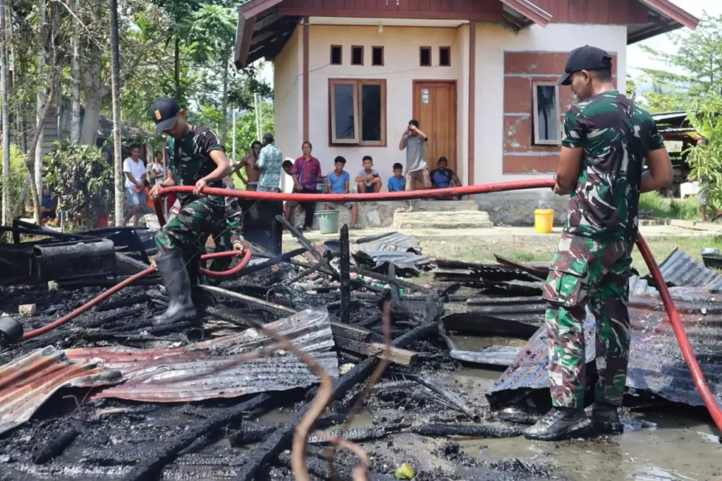 Kabupaten Keerom – Prajurit Satuan Tugas Pengamanan Perbatasan Statis RI-PNG Yonif 122/TS Pos Kotis menunjukkan keberaniannya dalam membantu tugas bidang kemanusiaan dengan turun tangan dalam upaya pemadaman Api yang melanda rumah seorang warga di Kampung Wonorejo, Distrik Mannem, Kabupaten keerom, Papua, Minggu (31/3/2024).