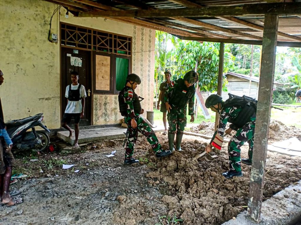 Keerom ~ Dalam ciptakan rumah tinggal yang nyaman, Pos Bompay Satgas Yonif 310/KK hadir membantu Carles Swo (47) salah satu warga Kampung Bompay dalam pembuatan teras rumah di Distrik Waris, Kabupaten Keerom, Papua, Minggu (12/5/2024).