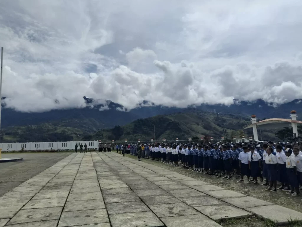 Upacara dipimpin oleh Inspektur Upacara Asisten I Sekda Lanny Jaya Leteran Yigibalom, dengan Komandan Upacara Miletus Wenda ( Guru SD Rujukan Inpres Tiom).