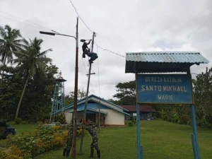 Kabupaten Keerom- Satuan Tugas Pengamanan Perbatasan RI-PNG Yonif 122/TS Kipur C Pos Waris bersama masyarakat membantu pemasangan Instalasi listrik, guna...