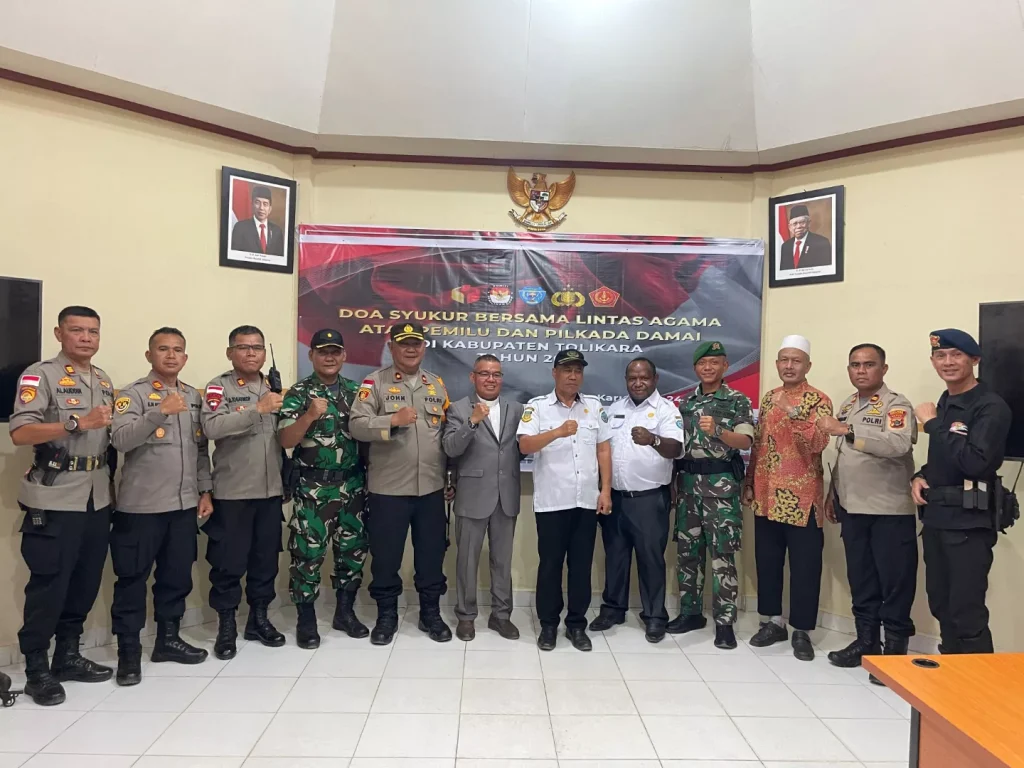 Satgas Yonif 721/Mks Pos Karubaga bersama Forkopimda Tolikara laksanakan doa syukur bersama atas pelaksanaan pemilu dan pilkada yang berjalan kondusif bertempat di Aula Polres Tolikara, Kab. Tolikara, Papua Pegunungan, Kamis, (25/04/24).