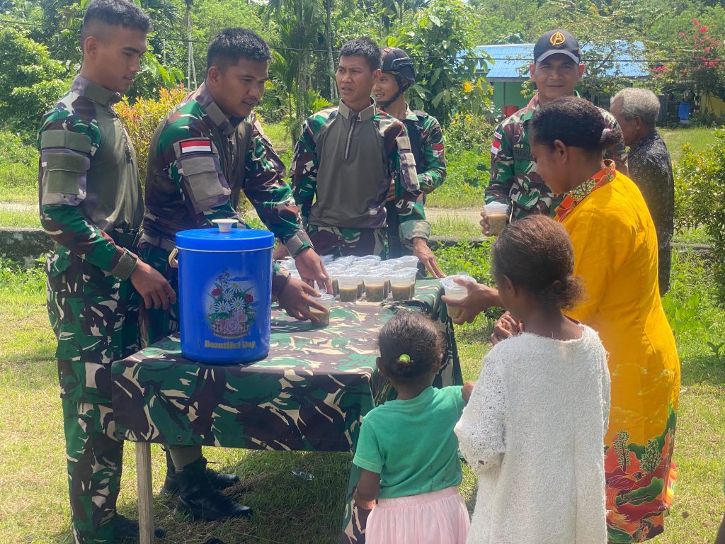 Kabupaten Keerom – Satuan tugas pengamanan perbatasan RI-PNG Yonif 122/TS Terus menjalin kebersamaan antara personel Pos Wambes dengan Masyarakat melalui kegiatan Ibadah bersama hari Minggu serta membagikan Makanan berupa bubur kacang hijau Kepada masyarakat Papua di Kp.Wambes, Wambes, Distrik Mannem, Kab. Keerom, Papua. Minggu (02-06-2024).