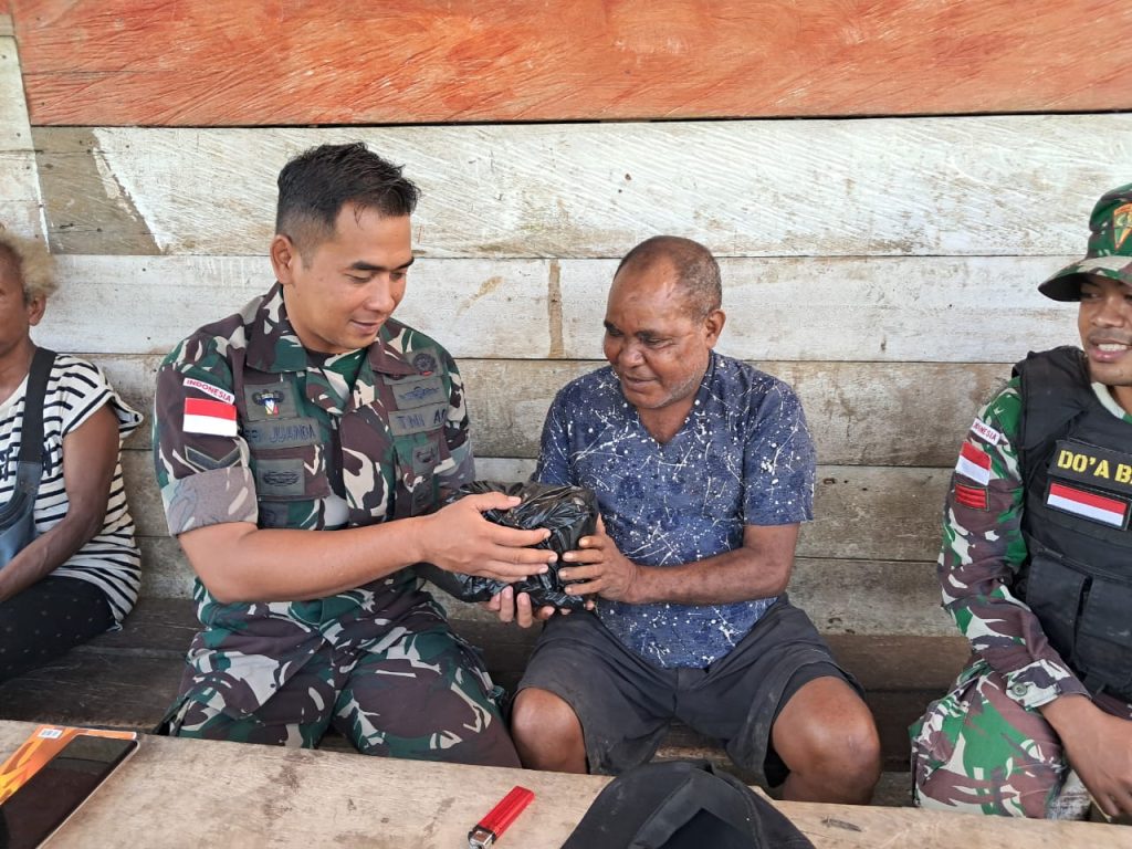 Personel Satgas Pamtas RI-PNG Yonif 122/TS Pos KM 76 dipimpin sersan dua Heri Juanda memberikan sembako kepada masyarakat Kampung Uskuar yang bertujuan untuk mempererat hubungan persaudaraan antara TNI dengan masyarakat agar adanya keberadaan Satgas ditengah-tengah masyarakat bisa menjadi terciptanya hubungan menjaga keutuhan wilayah perbatasan darat RI-PNG.