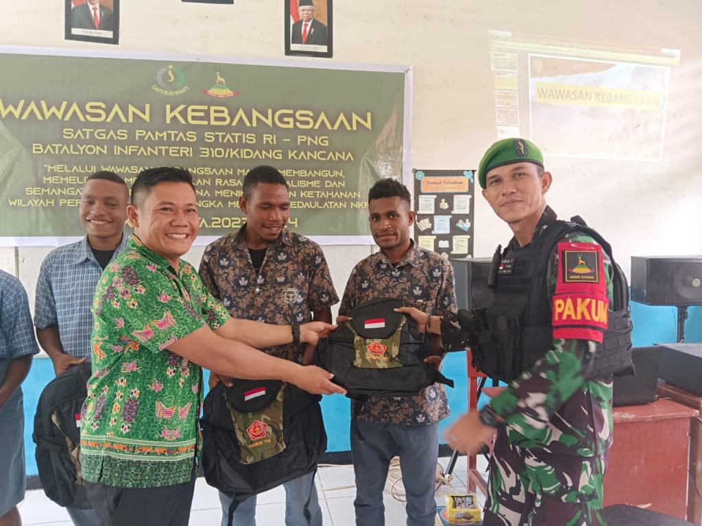 Keerom ~ Dalam rangka peringati Hari Lahir Pancasila serta tumbuhkan rasa cinta kepada bangsa dan negara para generasi muda diperbatasan, Pos Senggi Satgas Yonif 310/KK berikan Wasbang (Wawasan Kebangsaan) dengan materi 4 Pilar Kebangsaan kepada siswa-siswi SMKN 2 Keerom di Distrik Senggi Kabupaten Keerom, Papua, Kamis (30/5/2023l4).