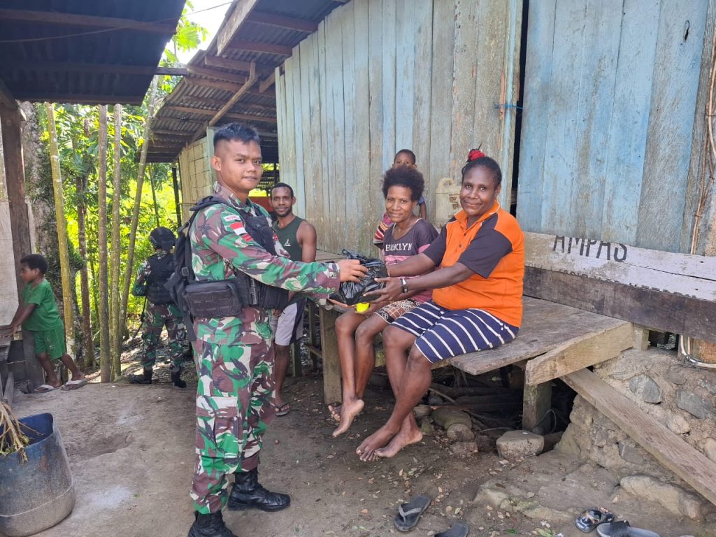 Kabupaten Keerom- Mempererat tali silaturahmi dengan masyarakat Pos ampas Satgas Pamtas RI-PNG Yonif 122/Tombak Sakti memberikan bingkisan kepada masyarakat Kampung Ampas, Disrik waris, keerom, papua(26-06-2024).
