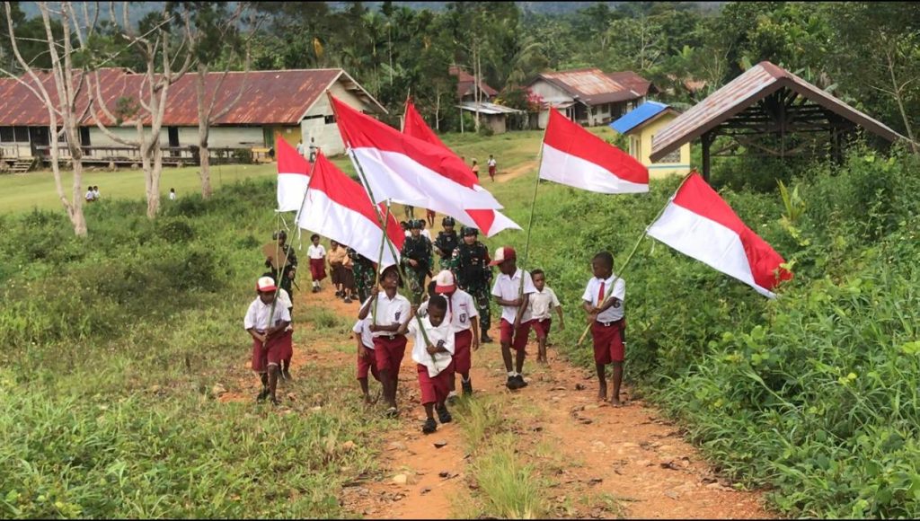 Keerom ~ Dalam rangka peringati Hari Lahir Pancasila, Pos Somografi Satgas Yonif 310/KK bersama siswa-siwi SD YPPK Akarinda kibarkan bendera Merah Putih di Puncak Bukit Somografi di Kampung Somografi, Distrik Web, Kabupaten Keerom, Papua, Sabtu (1/6/2024).
