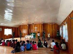 Sebagai bentuk perhatian terhadap masyarakat, Satgas Yonif 721/Mks Pos Malagay melaksanakan kegiatan mengajar sekolah minggu di Gereja Pinime Kampung Numbokawi,...