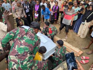 Kabupaten Keerom - Bentuk dukungan belasungkawa, Satgas Pamtas RI-PNG Yonif 122/TS Pos ujung karang membantu prosesi pemakaman Kepala Suku Kampung...