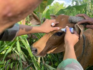Kabupaten Keerom - Tim Kesehatan Satgas Pamtas Statis RI-PNG Yonif 122/TS Pos Pitewi meberikan penangan kepada hewan ternak sapi yang...