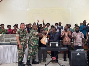Wamena - Komandan Kodim 1702/Jayawijaya Letkol Cpn Athenius Murip, S.H., M.H., menyerahkan bantuan alat musik kepada Gereja GKII Pniel Megapura,...