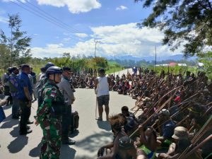 Satgas Pamtas Kewilayahan Yonif 721/Mks turut hadir dalam membantu Pemda Lanny Jaya dan Jayawijaya dalam proses mediasi perang suku dari...