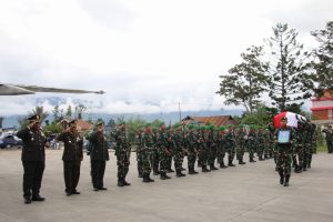 Wamena - Komandan Kodim 1702/Jayawijaya Letkol Cpn Athenius Murip, S.H., M.H., memimpin upacara pelepasan dan pemberangkatan sebagai penghormatan terakhir kepada...