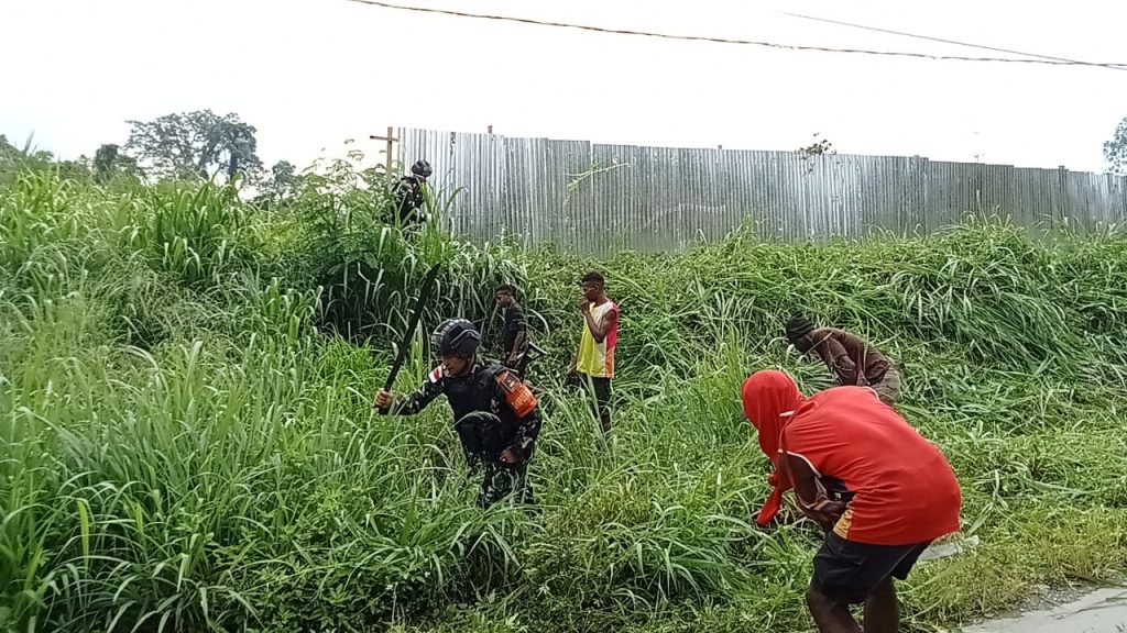 Keerom ~ Demi terciptanya lingkungan yang bersih, sehat dan asri, Pos Bompay Satgas Yonif 310/KK ajak warga bersihkan jalan kampung dan area lingkungan perumahan warga di Kampung Bompay, Distrik Waris, Kabupaten Keerom, Papua, Selasa (4/6/2024).