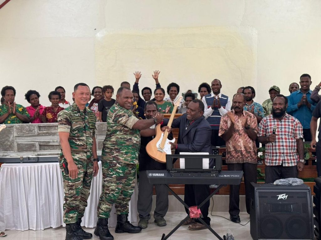 Wamena – Komandan Kodim 1702/Jayawijaya Letkol Cpn Athenius Murip, S.H., M.H., menyerahkan bantuan alat musik kepada Gereja GKII Pniel Megapura, bertempat di Gereja GKII Daerah Baliem Selatan Hitigima Jemaat Pniel Megapura Jl. Trans Wamena-Kurima, Distrik Assolokobal, Kabupaten Jayawijaya, Provinsi Papua Pegunungan, Minggu (16/06/2024).