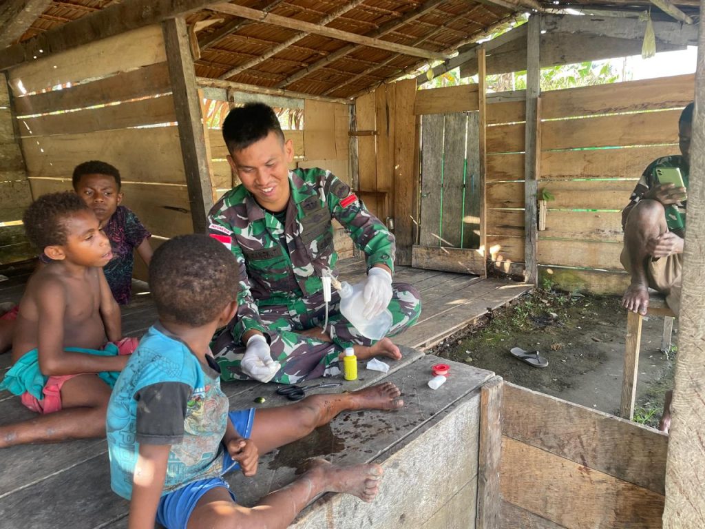Kabupaten Keerom – Sebagai wujud kepedulian, Satuan tugas pengamanan perbatasan RI-PNG Yonif 122/TS berikan pengobatan kepada anak-anak Kampung Ampas, yang mengalami luka dibagian kaki, Distrik waris, Kabupaten Keerom Papua,(27/07/2024).