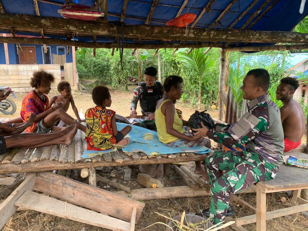 Kabupaten Keerom- Mempererat tali silaturahmi dengan masyarakat Pos Km 76 Satgas Pamtas Statis RI-PNG Yonif 122/TS memberikan bingkisan dan pelayanan kesehatan kepada masyarakat Kampung Uskuar dengan mengunjungi tiap rumah warga yang berada di sekitaran Pos Km 76 di wilayah Kampung Uskuar, Distrik Mannem, Kabupaten Keerom, Papua , Senin (15-07-2024).