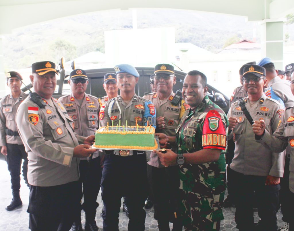 Karubaga, Kapolres Tolikara Kompol Irianto Jhon, S.Sos,M.H beserta Jajaran memberikan Kejutan Dalam Rangka HUT Ke-1 Kodim 1716/Toikara bertempat Makodim 1716/Tolikara Jln Koramil Distrik Karubaga Kab Tolikara Prov Papua Pegunungan ( Senin, 15 Juli 2024 )