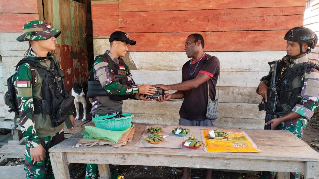 Kabupaten Keerom – Mempererat tali silaturahmi dengan masyarakat Pos Km 76 Satgas Pamtas RI-PNG Yonif 122/Tombak Sakti memberikan bingkisan kepada masyarakat Kampung Uskuar, Distrik Mannem, Kabupaten Keerom, Papua, Senin (01-07 -2024).