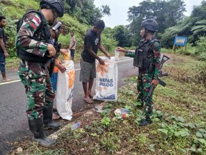Keerom ~ Banyaknya sampah yang menumpuk di kanan kiri jalan utama, Pos Unggalom Satgas Yonif 310/Kk bersama dengan masyarakat melaksanakan...