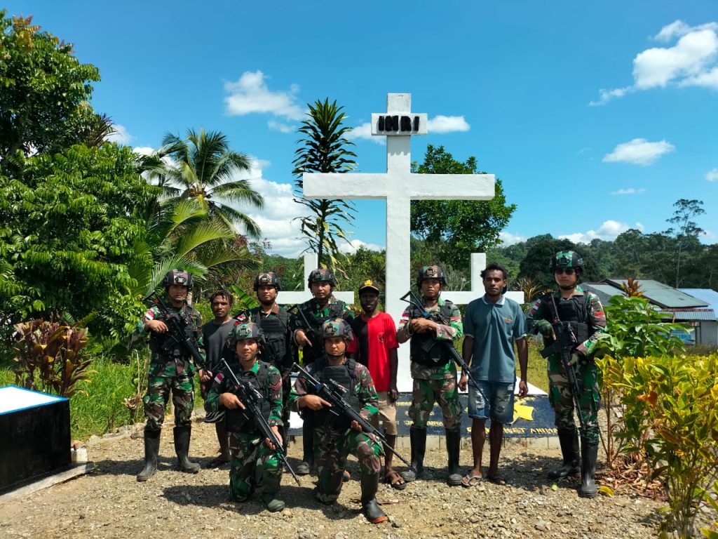 Keerom ~ Kemanunggalan TNI dengan rakyat terus dilakukan, Pos Ubrub Satgas Yonif 310/KK bersama warga sekitar percantik Tugu Salib Umuaf di Kampung Umuaf, Distrik Web, Kabupaten Keerom, Papua, Kamis (11/7/2024).