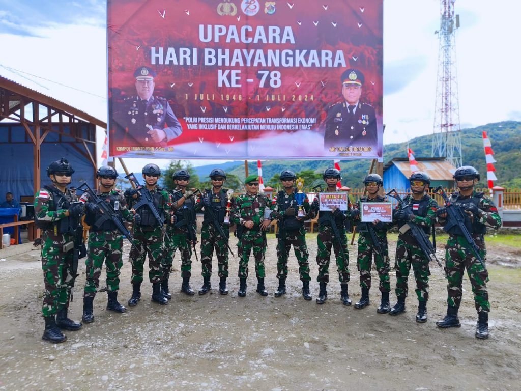 Satgas Pamtas Kewilayahan Yonif 721/Mks Pos Karubaga laksanakan kegiatan bersama masyarakat dan seluruh instansi yang ada dalam rangka memperingati HUT Bhayangkara ke-78 di Kab. Tolikara, Papua Pegunungan, Senin (01/07/24).