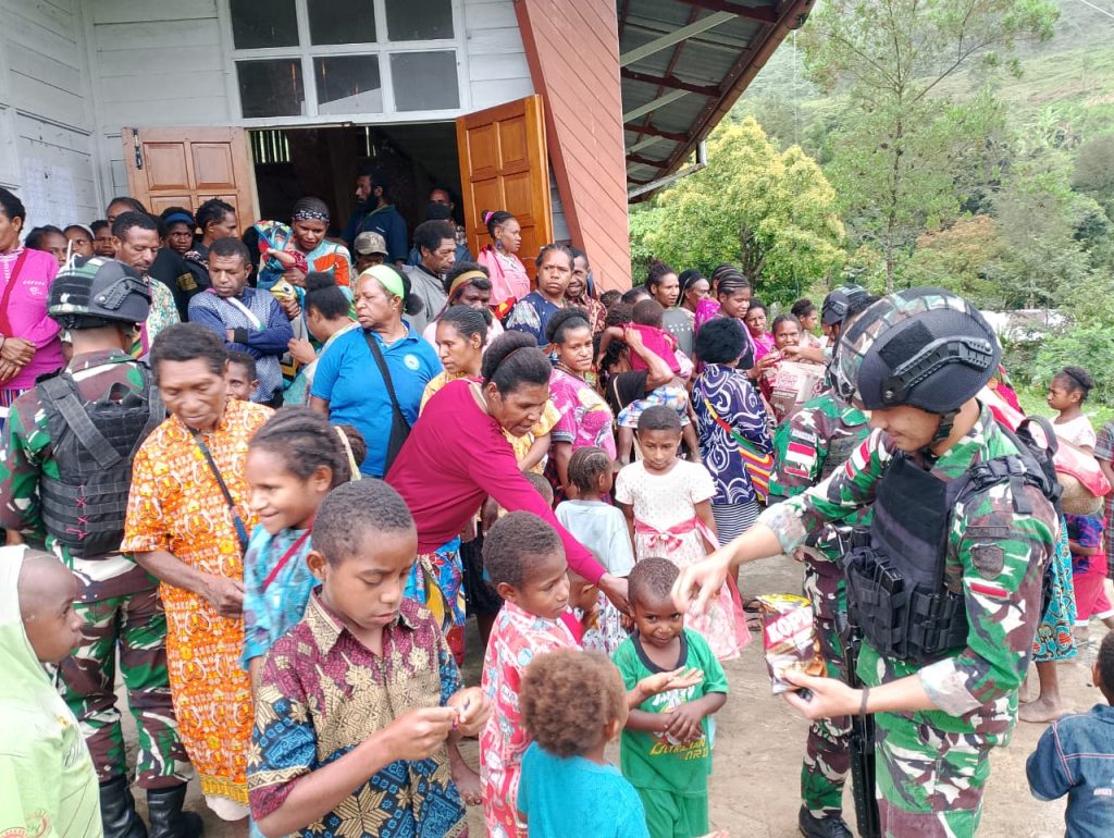 Okbibab, Papua ~ Usai melaksanakan ibadah minggu bersama di Gereja Katolik Paroki Bintang Timur, Pos Okbibab Satgas Yonif 310/KK bagikan makanan ringan kepada warga serta anak-anak perbatasan di Kampung Abmisibil, Distrik Okbibab, Kabupaten Pegunungan Bintang, Minggu (30/6/2024).
