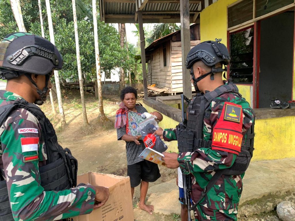 Dalam pelaksanaannya, Danpos (Komandan Pos) Unggalom, Serma Agus Sopian bersama anggotanya berkeliling kampung mengunjungi warga dari rumah ke rumah. Selain membagikan pakaian, personil Satgas pun membagikan alat tulis berupa buku dan bolpoint kepada anak-anak di kampung tersebut.