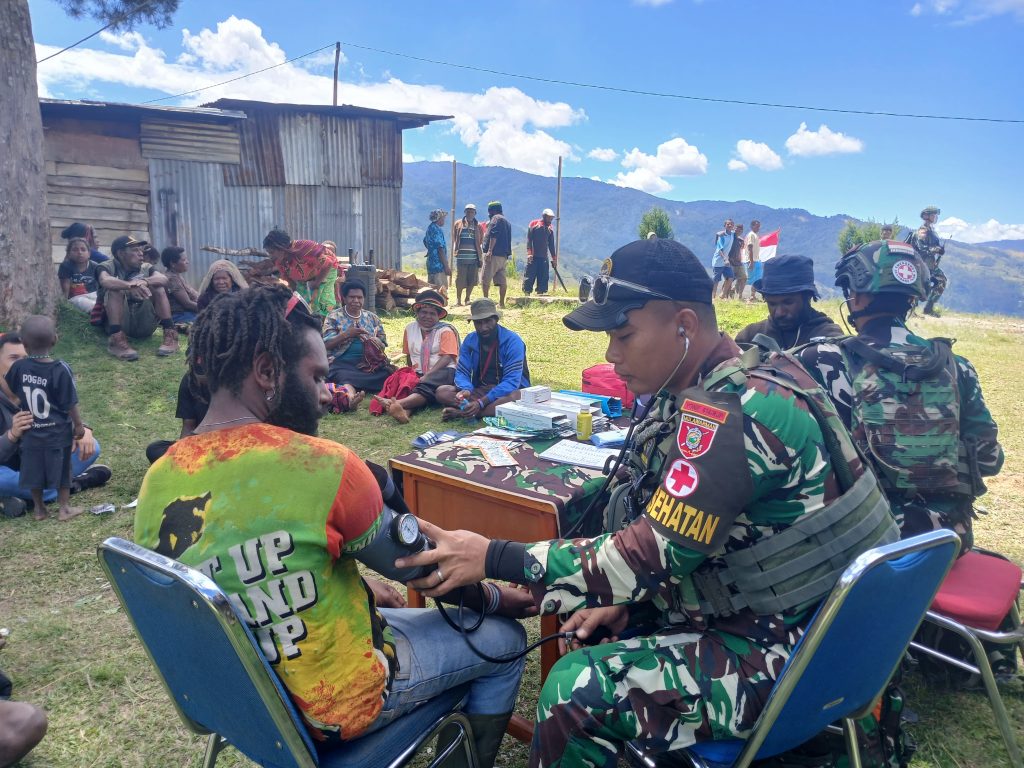 LANNY JAYA – Dalam Rangka memperingati Hari Ulang Tahun Ke – 16 Yonif 614/Raja Pandhita, Brigif 24/Bulungan Cakti, Kodam VI/Mulawarman dan Menyambut HUT Ke – 79 RI, Pos Tiom (Kotis) melaksanakan acara Bakar Batu dan Pelayanan Kesehatan Geratis di Kampung Konikme, Distrik Yugungwi, Kabupaten Lanny Jaya, Papua Pegunungan.