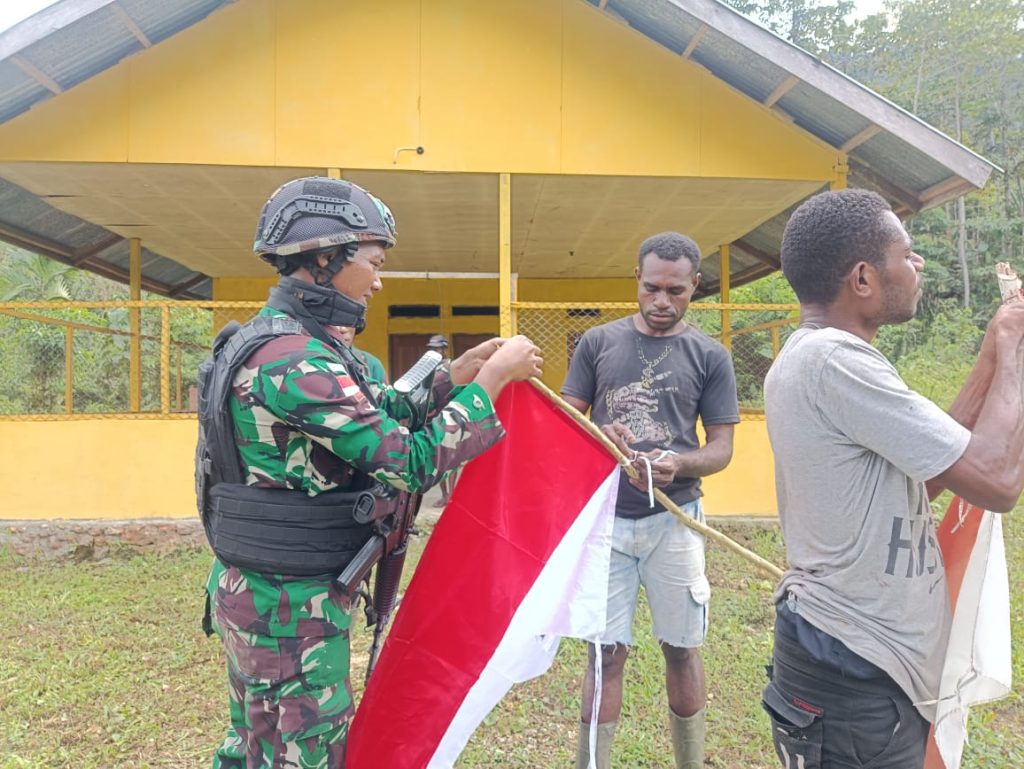 Kabupaten Keerom – Semangat pengabdian Prajurit Satgas Pamtas RI-PNG Yonif 122/TS Pos KM 76 melaksanakan kegiatan Karya Bakti Pemasangan bendera merah putih dan penananam 150 bibit pohon kemiri, Kampung Uskuar, Distrik Mannem, Kabupaten Keerom,(08/08/2024).