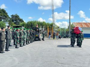 Wamena - Danramil 1702-01/Wamena Mayor Inf Aprin Paembonan memimpin upacara pelepasan dan pemberangkatan sebagai penghormatan terakhir kepada almarhum Sertu Adnan,...