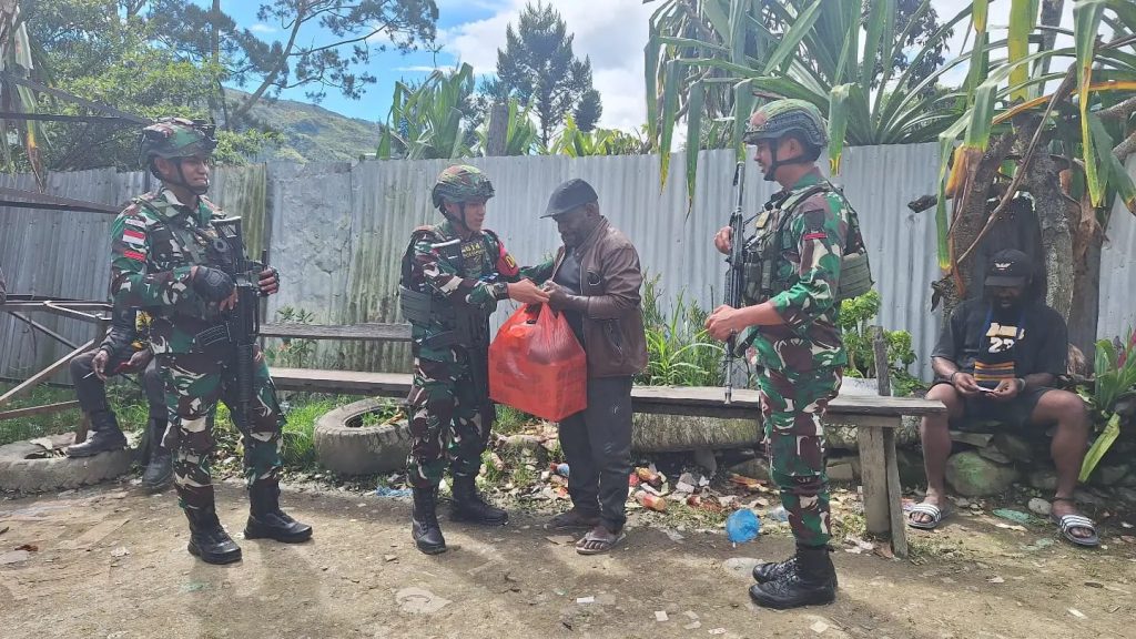 TOLIKARA– Pos Karubaga, Yonif 614/Raja Pandhita, Brigif 24/BC, Kodam VI/Mlw, melaksanakan anjangsana dan pemberian sembako kepada salah satu tokoh pemuda yang ada di Kelurahan Karubaga, Kecamatan Karubaga, Kab. Tolikara, Papua Pegunungan, Minggu (11/8/2024)