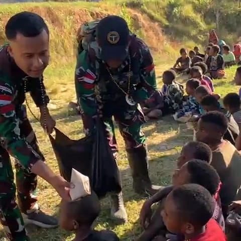 LANNY JAYA – Satgas Yonif 614/Raja Pandhita, Brigif 24 /BC, Kodam VI/Mulawarman, Pos Popome menggelar perjamuan dengan membagikan ratusan bungkus makanan kepada masyarakat Desa Popome, Distrik Mokoni, Kabupaten Lanny Jaya, Papua Pegunungan.